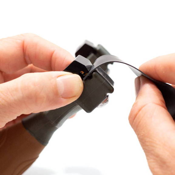 Place the band into the groove of the frame and under the "tooth" of the FlipClip.