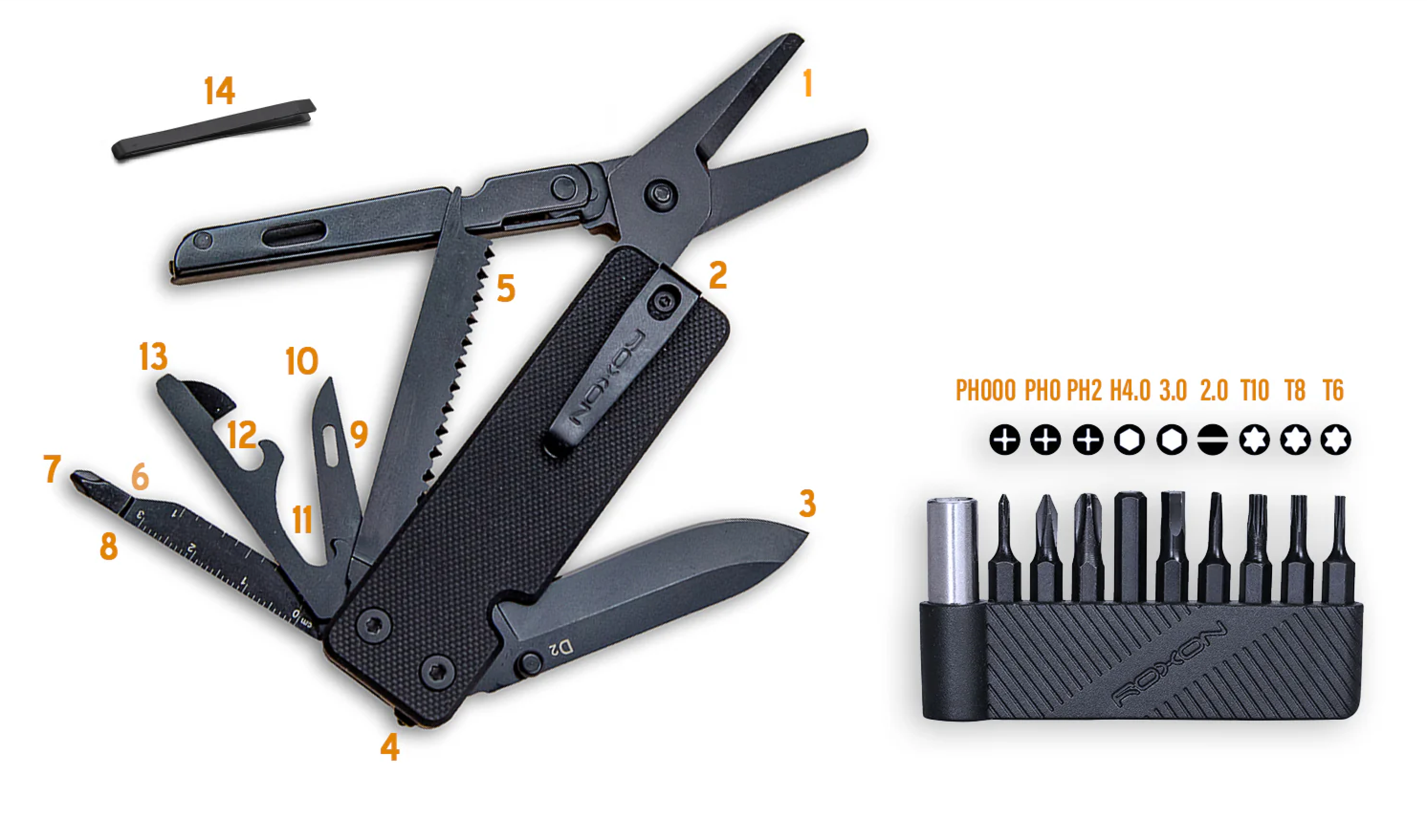 Designed to withstand hard use, it includes a full-size set of pliers, a sharp knife made with D2 tool steel, renowned for its ease of sharpening and good edge holding ability, rugged saw blade, precision scissors, and a smart mix of screwdrivers and utility tools.
